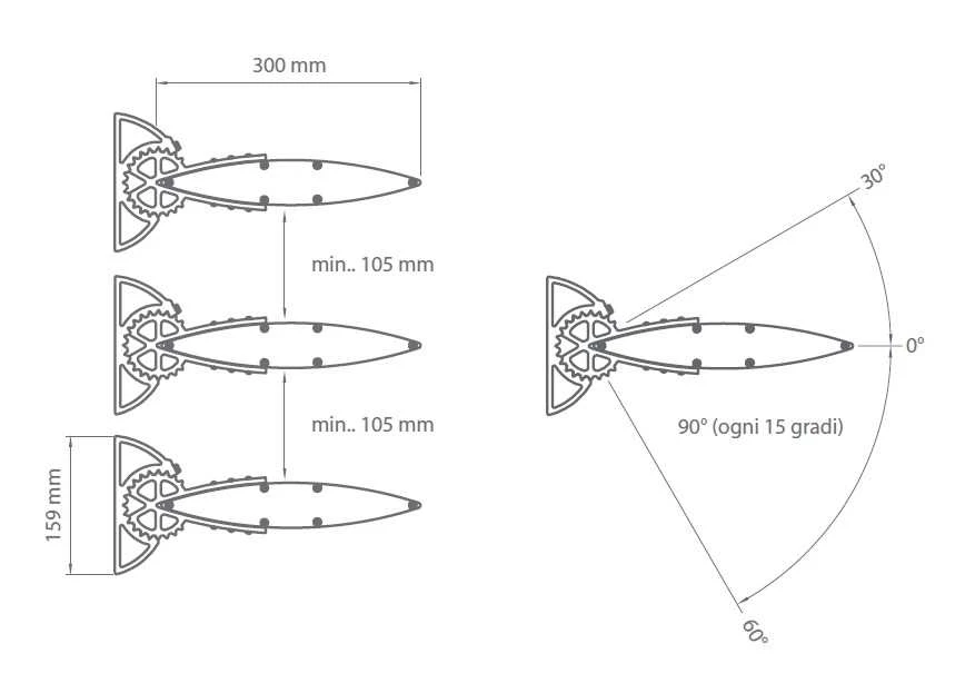 - L’uso di attacchi fissati direttamente alla pavimentazione consente di scegliere liberamente la distanza tra le lamelle durante l’installazione, senza doverla definire al momento dell’ordinazione.