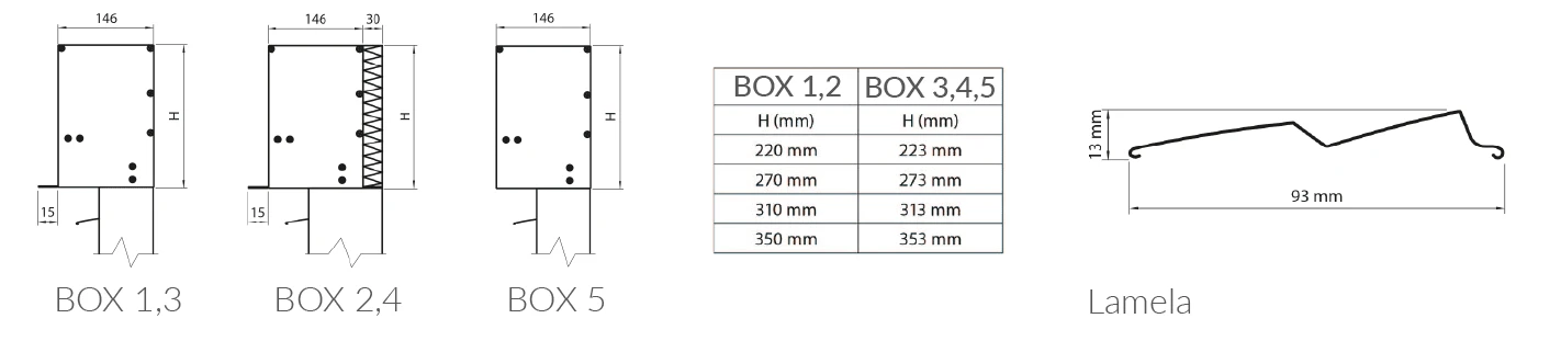 • Kasety BOX 1 oraz BOX 2 do montażu podtynkowego wykonane są z ekstrudowanego aluminium, wyposażone w wypust z blachy aluminiowej, umożliwiający wykonanie zewnętrznej wyprawy tynkarskiej